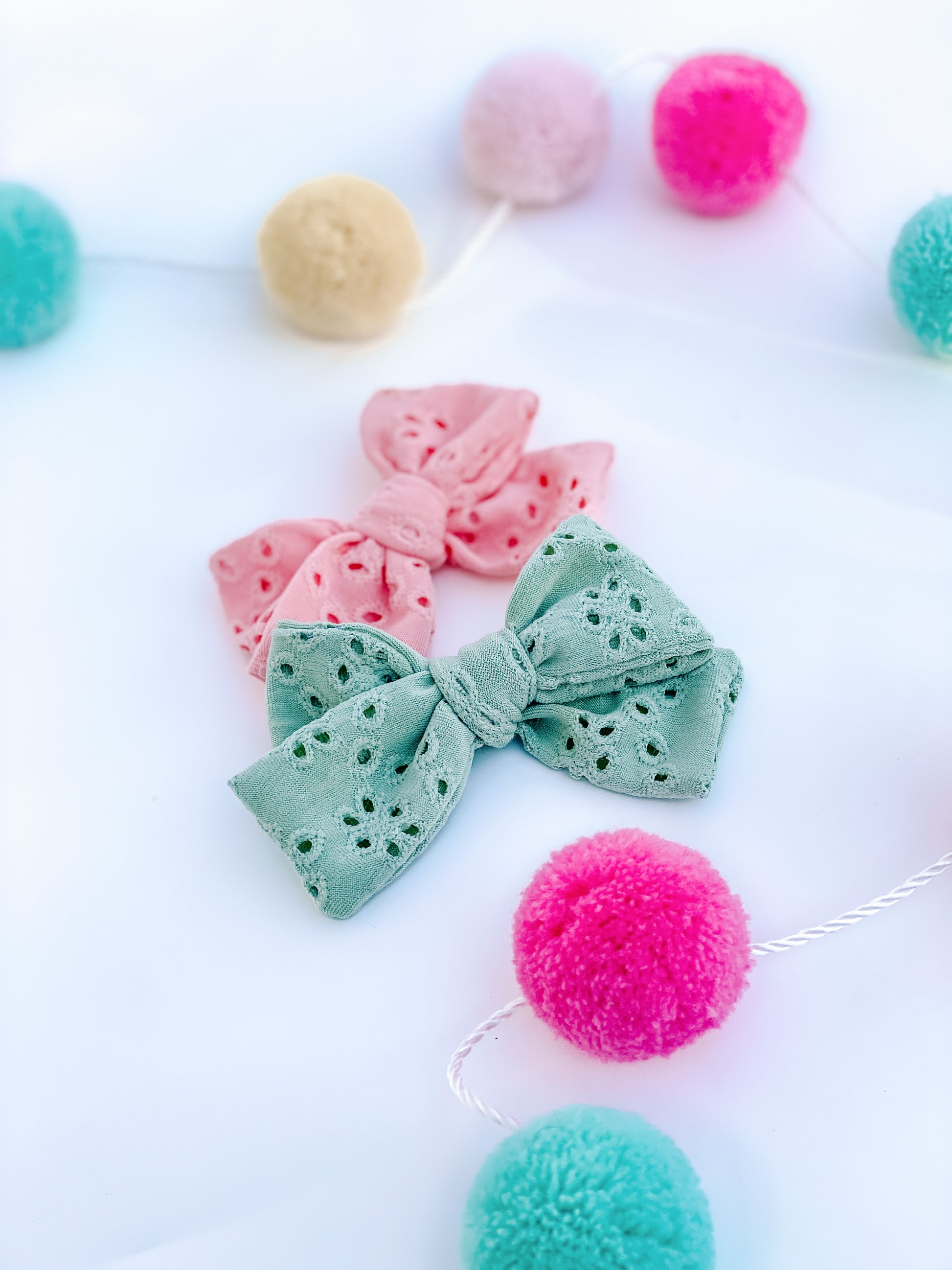 Add some flair to your little’s wardrobe with these beautiful eyelet bows! Delicately crafted in pretty pastel colors, these bows are a perfect way to add a special touch to any look.